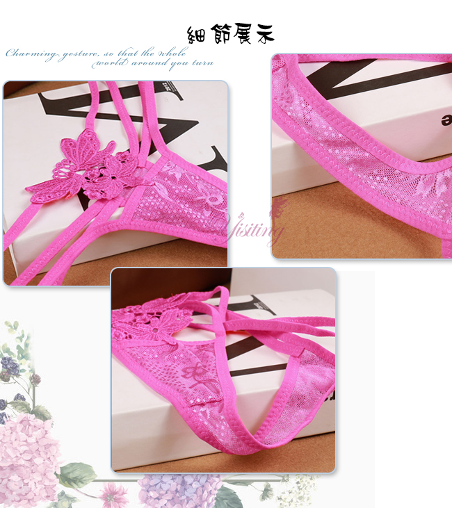 ►您現在的位置:首頁>甜蜜舞動!蝴蝶雙飛彈力細帶花卉網紗美臀T字褲﹝紫﹞