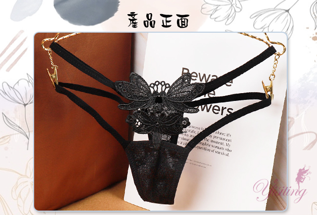 甜蜜舞動!蝴蝶雙飛彈力細帶花卉網紗美臀T字褲﹝黑﹞