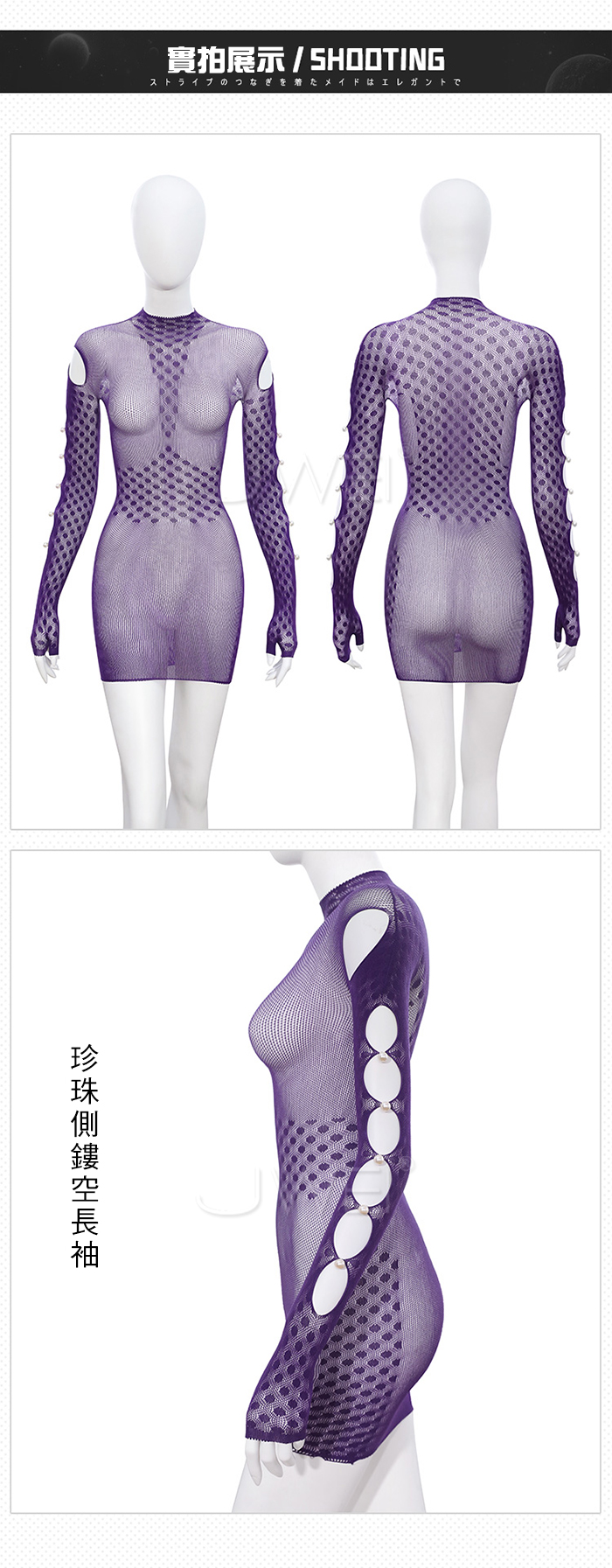 鄰家姐姐.高智感珍珠飾側鏤空長袖半高領包臀連身網衣-紫【單件網衣】